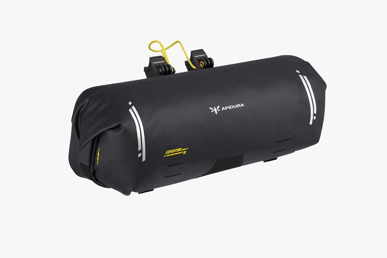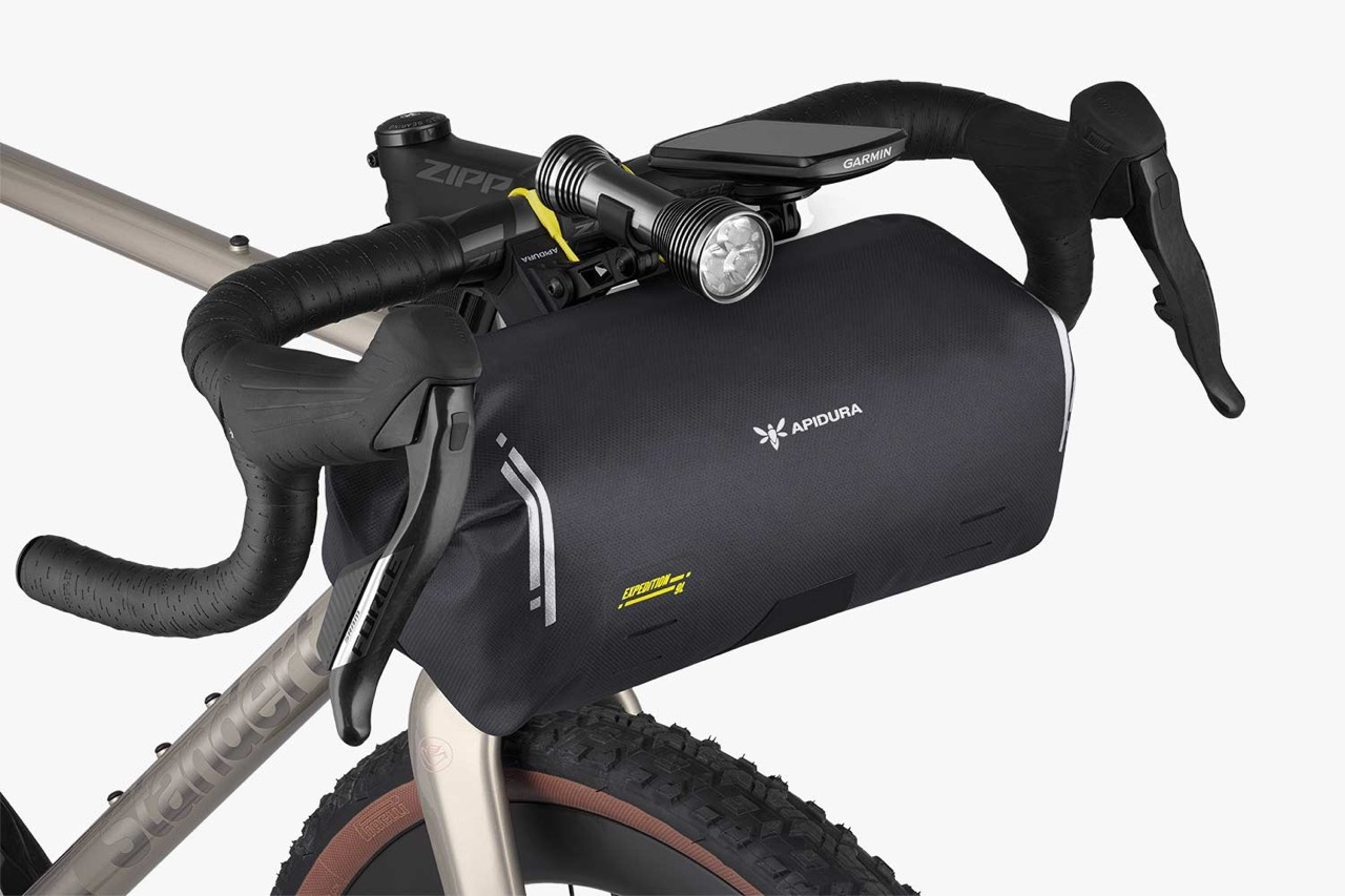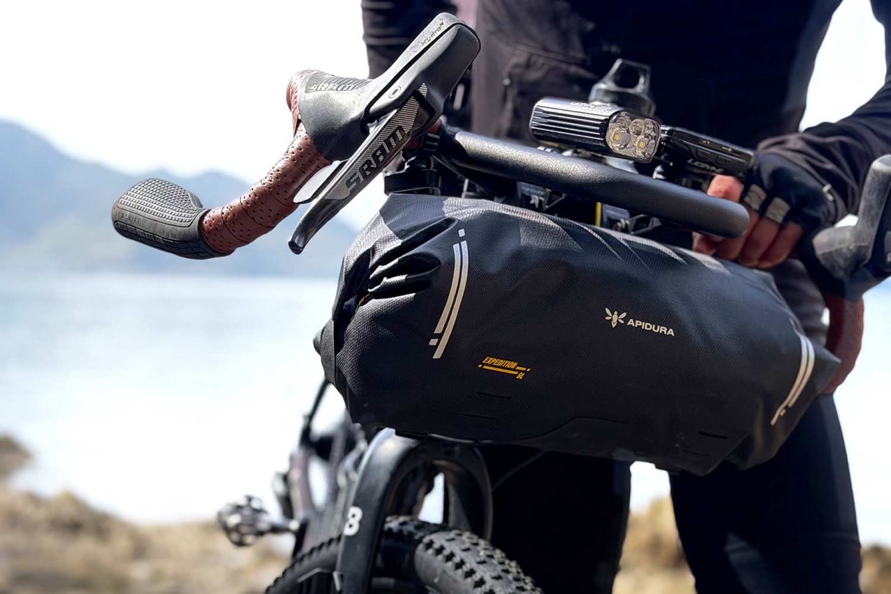 Ein modulares, am Lenker montiertes System für leichtes und komprimierbares Bikepacking-Equipment, das die Handposition des Fahrers nicht beeinträchtigt.