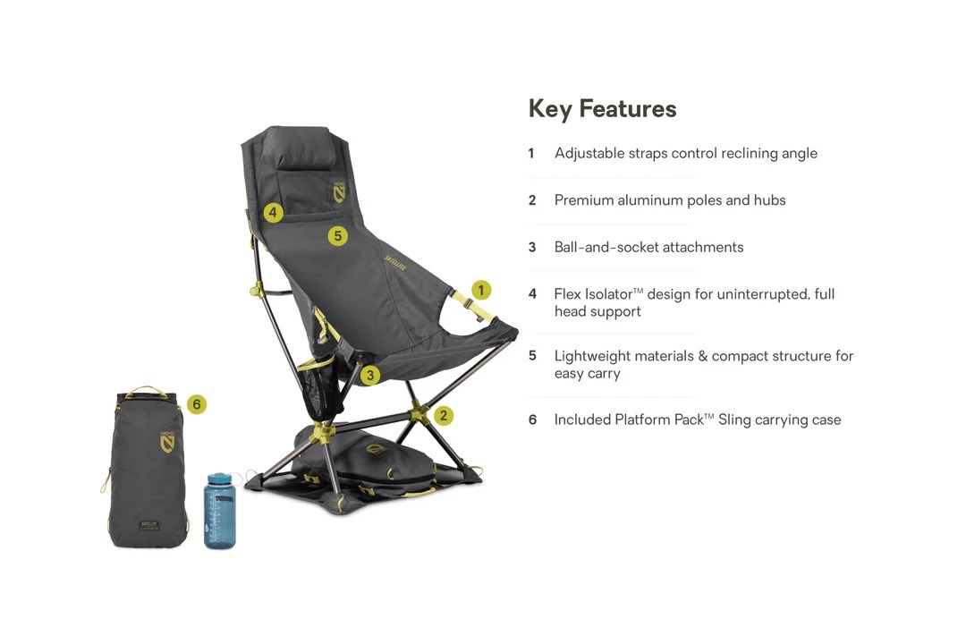 Satellite™ doesn’t just sit comfortably — it travels effortlessly. Packing down into a remarkably compact size, it tucks neatly into a NEMO Double Haul, the back of your car, a motorcycle side case, a kayak, or anywhere else space is at a premium. The included sling-style carrying case expands its utility, building on our Platform Pack™ technology by unfolding flat to pair with the chair and add stability on sandy or soft ground. A mesh cupholder integrated into the side keeps beverages close at hand, rounding out the details that make Satellite™ your go-anywhere lounge companion.