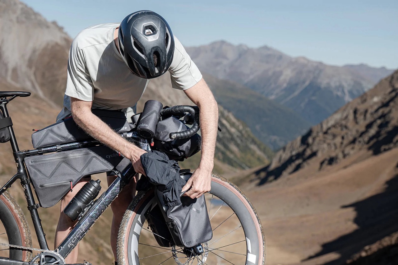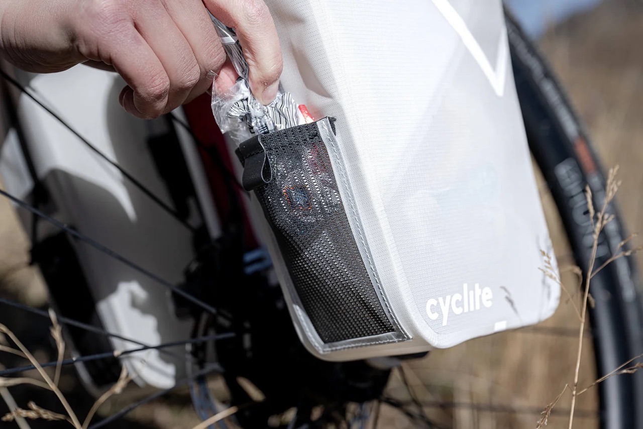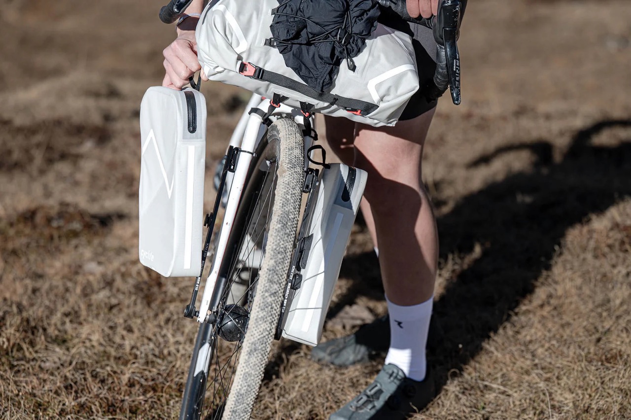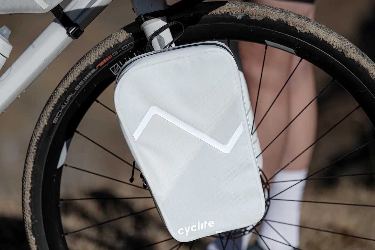 FORK BAG / 01 ist eine Gabeltasche für alle Bikepackerinnen und Bikepacker, die zusätzliches Volumen außerhalb des Rahmens benötigen, dabei aber nicht auf Aerodynamik verzichten wollen. Ihre Besonderheit ist das flache, keilförmig zulaufende Design, wodurch sie besonders windschnittig und aerodynamisch bleibt. In Kombination mit einem tiefen Schwerpunkt bleibt das Fahrgefühl weiterhin ausgewogen und natürlich. Eine stabile Innenstruktur verhindert zudem ein Ausbeulen – auch bei voller Ausnutzung des 3,1-Liter-Volumens. Hinzu kommt ein wetterfester Reißverschlusszugang zum Hauptfach sowie eine Netztasche mit Schnellzugriff für die kurzen Stopps unterwegs. Befestigt wird die FORK BAG / 01 über eine schnelle, unkomplizierte und zuverlässige Verriegelung – und dabei entweder direkt an vorhandenen Schraubgewinden der Gabel oder, bei Starr- und Federgabeln ohne Gewinde, per Steckachsen am Fahrrad. Für die Montage per Steckachse wird zusätzlich eine passende Adapterlösung wie das Axle Pack von Old Man Mountain benötigt. Beide Befestigungsoptionen sind verdreh- und verrutschfest. FORK BAG / 01 kann entweder einzeln als Variante für die rechte oder linke Radseite oder im Set mit Taschen für beide Radseiten erworben werden.