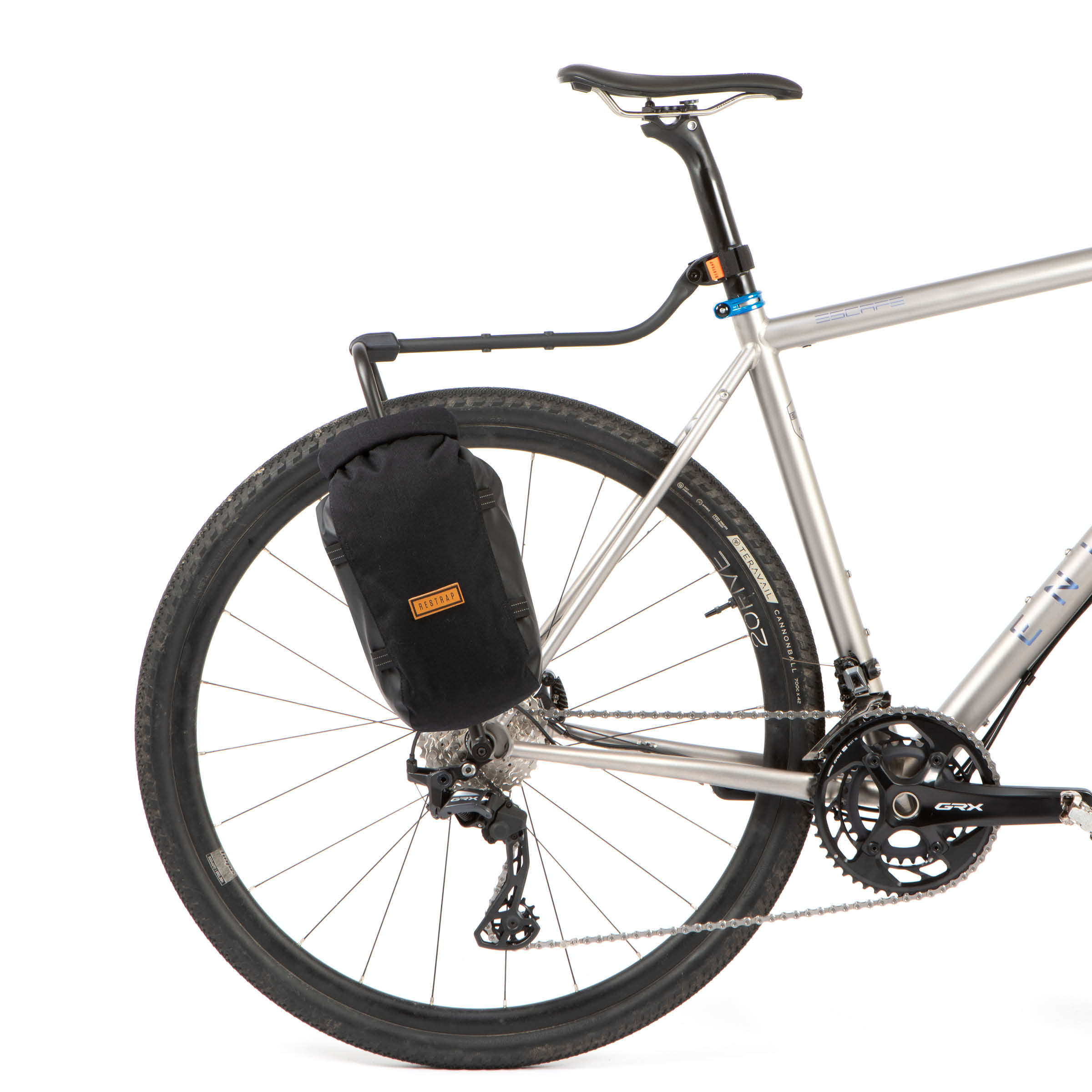 Entfernen Sie das Klettband aus der Sattelstützen-/Rohrklemme und führen Sie es erneut ein, sodass sich das Restrap-Logo-Label auf der Antriebsseite befindet (denn Ästhetik ist wichtig).