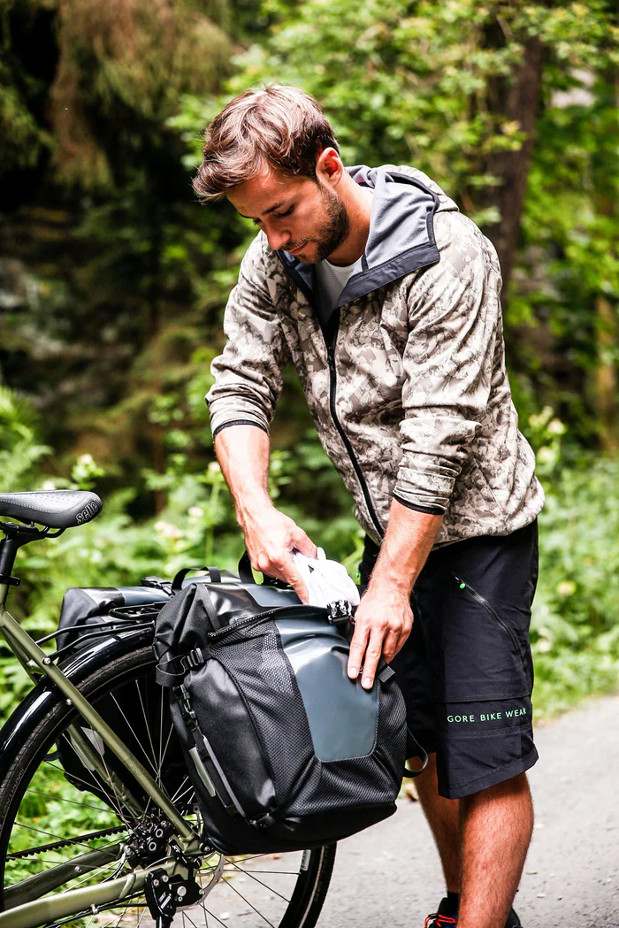 Zur Ausstattung gehört die praktische Fronttasche. Sie bietet vier Liter zusätzliches Volumen pro Tasche für schnell benötigte Gegenstände, ist aber nicht wasserdicht. Der zuverlässige Rollverschluss schützt den Tascheninhalt vor Nässe und Schmutz. Das Quick-Lock-Halterungssystem ermöglicht eine einfache und sichere Befestigung an gängigen Gepäckträgern.