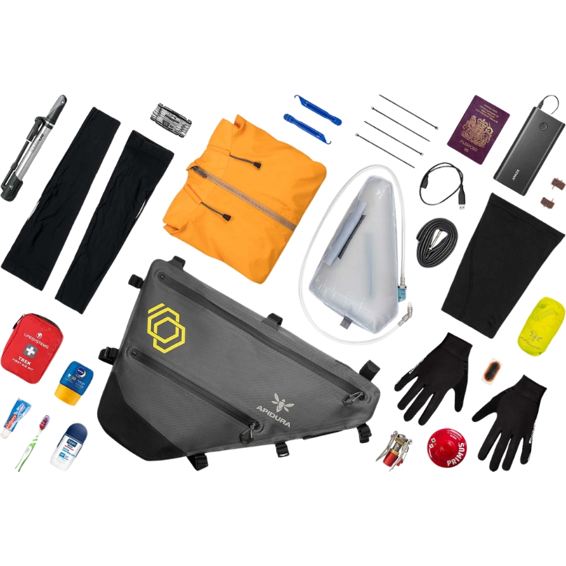 It’s constructed from a lightweight fabric, custom milled to Apidura’s specifications and able to be welded together at the seams to create a watertight seal. Zippers with protected closures ensure that kit stays dry, even in a sustained downpour. A battery lead/hydration hose port is handy for charging devices or staying hydrated on the road.